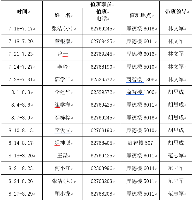当前位置: 首页 >> 通知公告 >> 正文 党委教师工作部、人事处(教师发展中心)关于2024年暑假值班安排的通知 时间:2024年07月12日 16:05 作者: 校内各单位: 根据学校《关于2024年暑假放假及开学安排的通知》要求,为保障广大教职工在暑假期间顺利办理人事相关业务,现将党委教师工作部、人事处(教师发展中心)2024年暑假值班安排通知如下: 党委教师工作部、人事处(教师发展中心) 2024年7月12日 上一条:太阳成集团tyc122cc关于2024年校聘合同制工作人员招聘资格审核及面试有关事宜的通知 下一条:太阳成集团tyc122cc关于2024年校聘合同制工作人员招聘笔试相关安排的通知 【关闭】