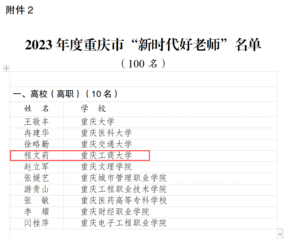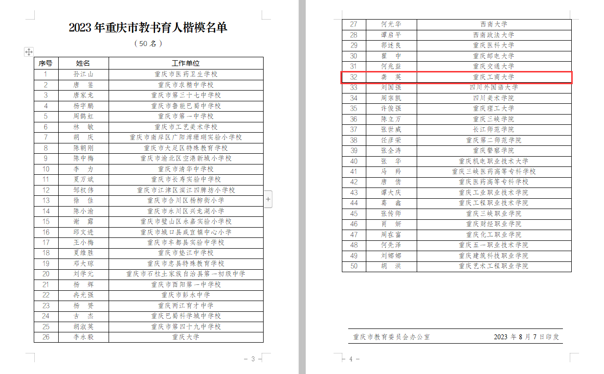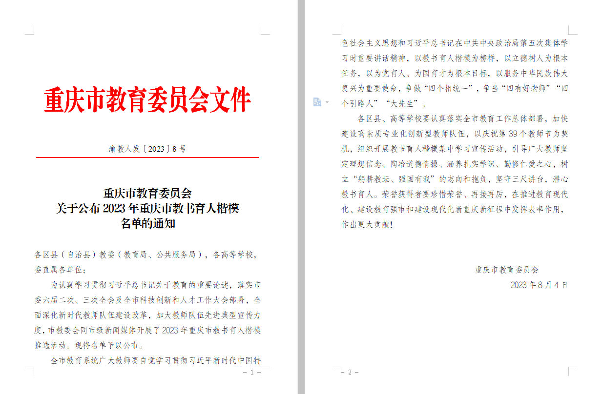 当前位置: 首页 >> 工作动态 >> 正文 喜报:我校教师获评重庆市“新时代好老师”和重庆市教书育人楷模 时间:2023年09月08日 11:10 作者: 为深入贯彻落实党的二十大精神,贯彻落实习近平总书记关于青少年成长成才、加强家风家教和师德师风建设等方面的重要讲话精神,贯彻落实市委六届二次全会精神,2023年3月至6月,市委宣传部、市文明办、市教委、团市委、市妇联、市关工委联合开展了重庆市 2023 年度“新时代好少年、好老师、好家长”学习宣传活动。经区县(各高校)推荐、专家综合评审、活动组委会审定等环节,选树出“新时代好老师”100名(其中高校教师10名),我校会计学院教师程文莉获评“新时代好老师”。 为认真学习贯彻习近平总书记关于教育的重要论述,落实市委六届二次、三次全会及全市科技创新和人才工作大会部署,全面深化新时代教师队伍建设改革,加大教师队伍先进典型宣传力度,市教委会同市级新闻媒体于2023年5月至8月开展了教书育人楷模推选活动,经各区县、各高校推荐、专家综合评审、活动组委会审定等环节,共选树出50名重庆市教书育人楷模(其中高校教师25名)。我校管理科学与工程学院教师龚英获评“2023年重庆市教书育人楷模”。 希望校内各单位以庆祝第39个教师节为契机,认真开展对“新时代好老师”和教书育人楷模的学习和宣传,选树和培育更多的师德典型。希望广大教师要自觉学习贯彻习近平新时代中国特色社会主义思想和习近平总书记在中共中央政治局第五次集体学习时重要讲话精神,以“新时代好老师”和教书育人楷模为榜样,以立德树人为根本任务,以为党育人、为国育才为根本目标,以服务中华民族伟大复兴为重要使命,争做“四个相统一”,争当“四有好老师”“四个引路人”“大先生”。 上一条:躬耕教坛 强校有我 强国有我——我校召开第三十九个教师节庆祝表彰大会 下一条:校领导带队开展教师节前慰问活动 【关闭】
