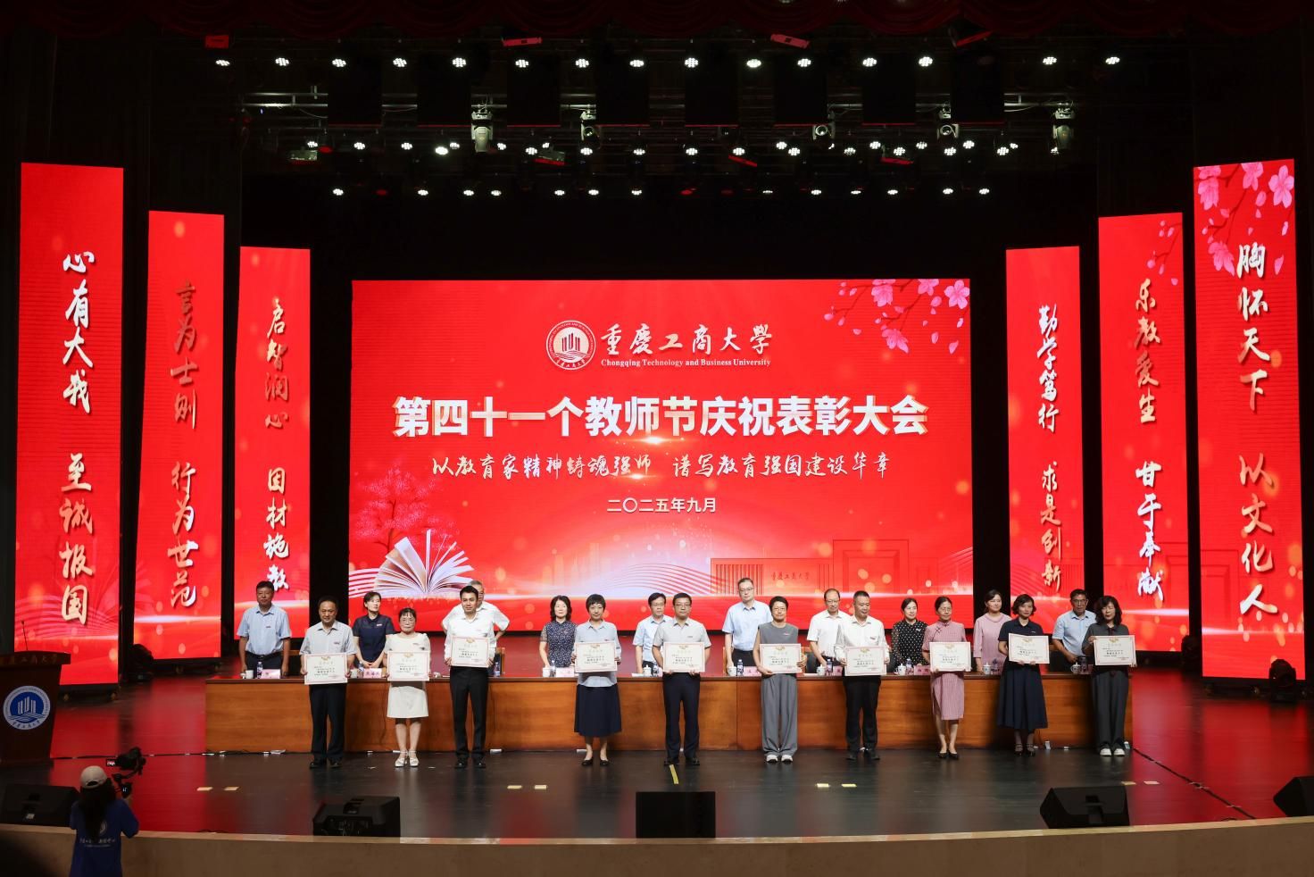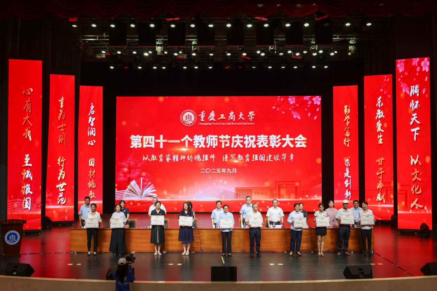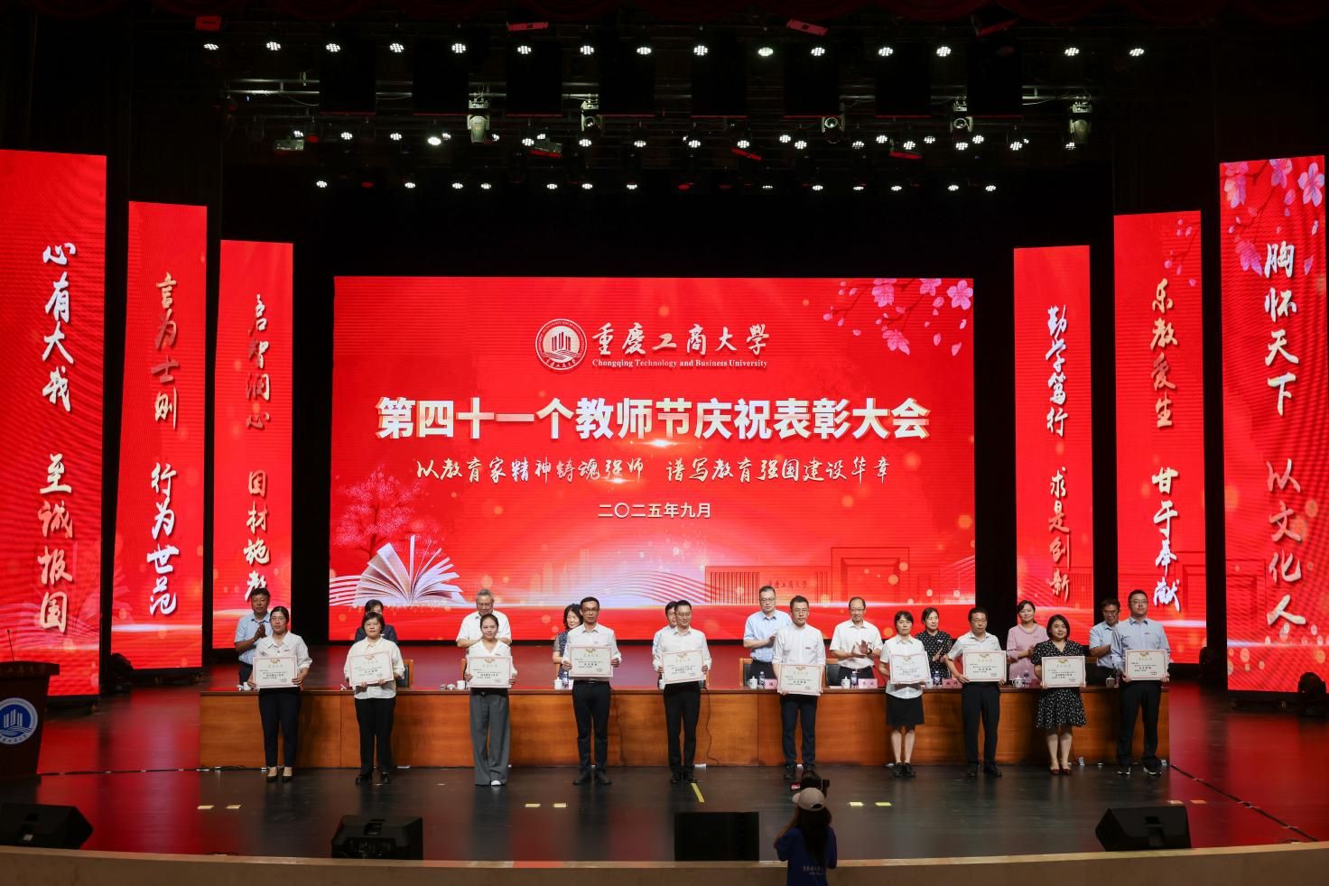 当前位置: 首页 >> 工作动态 >> 正文 授业传薪承远志 滋兰树蕙谱华章 学校举行第四十一个教师节庆祝表彰大会 时间:2025年09月11日 11:03 作者:邓艺 蒋梦宇 9月10日下午,学校在太阳成集团tyc122cc剧场举行教师节庆祝表彰大会。学校党委书记曾维伦出席会议并讲话。校长温涛主持会议。 曾维伦代表学校向全体教职员工致以诚挚节日的问候,向受到表彰的先进个人和集体表示热烈的祝贺,向光荣退休和从事教育工作满三十年的教职工致以崇高的敬意,向新入职的教职员工表示热烈的欢迎。 曾维伦指出,过去一年,学校深入学习贯彻习近平总书记关于教育的重要论述和全国教育大会精神,实施教育家精神铸魂强师行动,教师队伍建设取得良好成效。全体教职员工大力弘扬教育家精神,在各自岗位上勇担重任、砥砺奋进、默默奉献,交出了一份亮丽的答卷。学校在办学层次、学科专业建设、科研创新、茶园校区建设等多个领域实现重大进展;不仅在优势领域继续保持前列,还在人才培养、服务社会等方面取得了新成效。这些成绩的取得,离不开每一位教职员工的辛勤付出,彰显了重工商大人为党育人、为国育才的使命与高度,挺膺担当、奋勇争先的拼搏与力度,甘为人梯、润泽学生的仁爱与温度。 曾维伦强调,以教育家精神铸魂强师,谱写教育强国建设华章,迫切需要加快建设一支政治素质过硬、业务能力精湛、育人水平高超的高素质专业化教师队伍。一要加强教师队伍思想政治建设,坚持不懈用习近平新时代中国特色社会主义思想武装头脑。要胸怀“国之大者”,立足本职岗位,追求“躬耕教坛,强国有我”的价值实现,忠诚于党的教育事业。二要强化“第一标准”,涵养高尚师德师风。自觉践行教育家精神,自觉加强师德修养,做到模范遵纪守法,模范遵守新时代教师职业行为准则。三要不断提升教师教书育人本领。牢固树立终身学习的意识,深入挖掘大学问、充盈大学识,涵养精神修养、文化气度和育人情怀。四要以服务“国之所需”作为最高追求。全力推动具有我校特色辨识度的“商工融合、多科协同”学科专业生态体系建设行稳致远,把教育家精神蕴含的“求是创新”意识、“至诚报国”追求转化为教育报国、科技报国的实际行动。希望广大教师立足岗位,忠诚履职,以卓越育人成效、高质量创新成果为教育强国、科技强国建设贡献力量。 曾维伦号召,全体教职工要深刻把握教育家精神的丰富内涵和实践要求,将其融入血脉、铸入灵魂、化为行动,以“躬耕教坛、强国有我”的志向和抱负,潜心教书育人,勇攀学术高峰,努力成长为党和人民可以信任和依靠的“大先生”。 温涛在主持中表示,过去一年里学校全面贯彻落实党的二十大和二十届二中、三中全会精神,深入学习贯彻习近平总书记关于教育的重要论述和全国教育大会精神,全体教职员工坚守立德树人初心,牢记“为党育人、为国育才”使命,同心同德,奋力拼搏,谱写了学校教育事业发展的新篇章。希望教师们在教学中深耕,在科研中突破,在服务中创新,共同书写学校发展的新篇章;要继续以赤诚之心、奉献之心、仁爱之心投身教育事业,认真落实全国教育大会精神,以教育家精神铸魂强师,谱写教育强国建设华章。 大会为第四批重庆市学术技术带头人及后备人选、2025年巴渝学者计划人选颁发了证书;表彰了第三批师德先进个人,2024-2025学年优秀教师、优秀教育工作者,第五届重庆市高校教师教学创新大赛、第四届川渝青年教师风采大赛、太阳成集团tyc122cc第六届教师教学奖获奖人员,2024-2025学年优秀辅导员、2023-2025学年标兵辅导员,并为满30年教龄的教师和从事学校工作满30年的教职工颁发纪念证书。 校领导为第四批重庆市学术技术带头人及后备人选、2025年巴渝学者计划人选颁发证书 校领导为第三批师德先进个人颁奖 校领导为2024-2025学年优秀教师、优秀教育工作者颁奖 校领导为第五届重庆市高校教师教学创新大赛、第四届川渝青年教师风采大赛、太阳成集团tyc122cc第六届教师教学奖获奖人员颁奖 校领导为2024-2025学年优秀辅导员、2023-2025学年标兵辅导员颁奖 校领导为满30年教龄的教师和从事学校工作满30年的教职工颁发纪念证书 会上,曹策俊老师作为优秀青年教师代表发言。他从“初心、科研、教学、责任”四个方面分享自身感悟,表示将秉承教育家精神,以铸魂强师为己任,以潜心科研、扎根讲台为使命,在不断提升自身素养的道路上坚定前行,为学校学科专业长远发展和人才培养质量持续提升,为谱写教育强国建设的华章贡献更大的力量。 大会举行了新教师宣誓仪式,教师代表周婧云老师带领新教师代表庄严宣誓。 大会为退休教职工举行了荣休仪式。学生代表们手捧鲜花,感恩他们在普通却崇高的教育岗位上的勤恳付出与默默奉献。 人工智能学院2024级汪蕾同学作为学生代表发言,她谈到,将会牢记老师的教诲,秉持“厚德博学、求是创新”的校训,珍惜在校的每一寸时光,潜心钻研知识,锤炼品德修为,以老师们为榜样,努力成长为有理想、敢担当、能吃苦、肯奋斗的新时代青年,用优异的成绩回馈师恩,用青春的力量为国家建设、民族复兴添砖加瓦。 全体校领导,受表彰人员代表,全体中层干部和专职组织员,新老教师代表,教职工代表,学生代表出席会议。 上一条:校领导带队开展教师节前